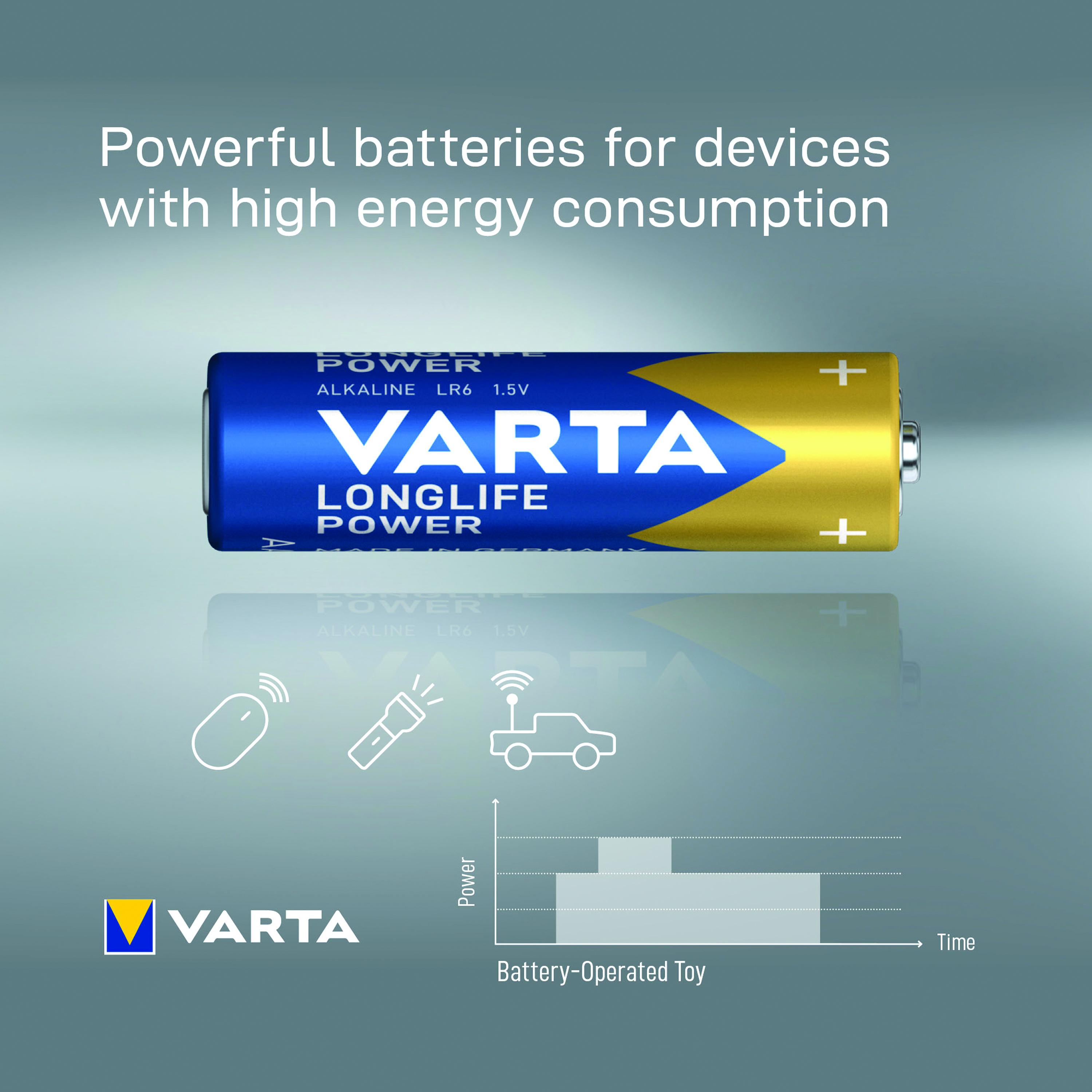 Varta Longlife Power is the most powerful of the Varta alkaline batteries. Developed especially for devices with high energy consumption. Stay independent with high performance battery power when using power hungry devices, such as remote controlled toys, computer equipment or LED flashlights.